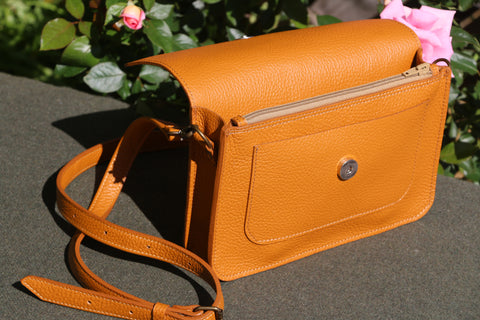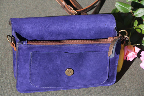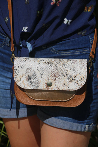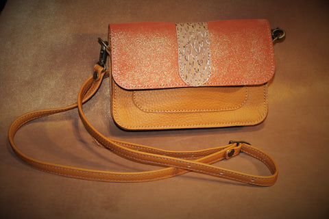 Petit sac à bandoulière pour tous les jours. Trois compartiments dont un à fermeture éclair. Cuir de vachette et cuir fantaisie