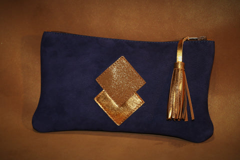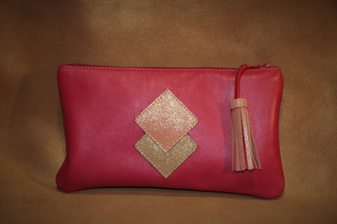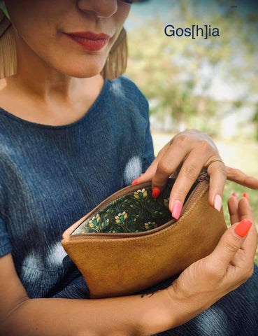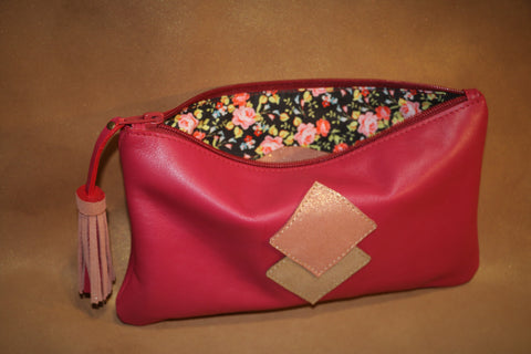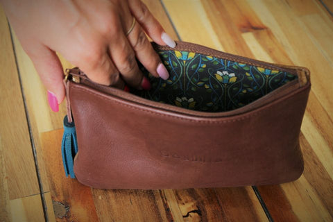 Pochette à fermeture éclaire, doublée avec un joli tissu, fermeture décorée avec un pompon en cuir.