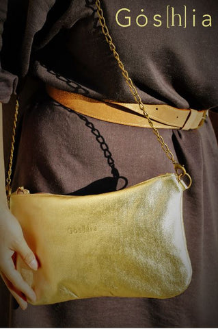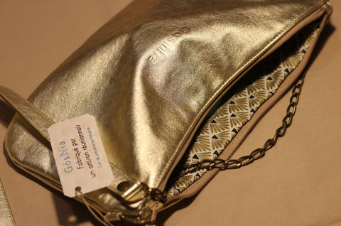 Pochette de soirée Mélodie avec fermeture éclaire, doublure tissus à motifs dorés, anses chainette laiton et cuir.